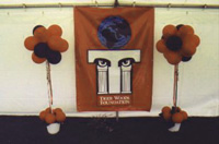 Public Television's ever popular "Purple Dinosaur" graces the stage in an Earth Day celebration for 15,000 youngsters. Phony Express' fantasy stage set included a giant tree, rainbow with cloud, fantasy flowers, and a hand-painted 5 foot revolving Earth balloon.