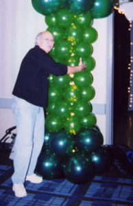 Peter Yarrow of Peter, Paul & Mary poses with elements of the "Puff The Magic Dragon" theme decorations created by Phony Express. A balloon castle entrance, topiary balloon trees, and a ceiling of glowing clouds surrounded the veteran artist as he sang. |