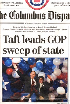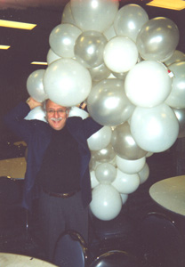 Balloons By Phony Express was commissioned to create the election night victory celebration balloon drop for the Ohio Republican Party. Governor Taft and Lt. Governor Bradley are shown here in the midst of the colorful patriotic balloons. The drop came at the finale of the evening's festivities, and appeared on television as well as in the local newspaper. |